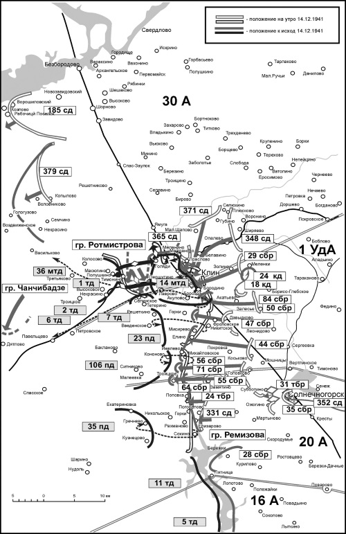 К середине дня 14 декабря маневр двух других бригад 1-й УдА, который выводил их к Клину, был близок к завершению.