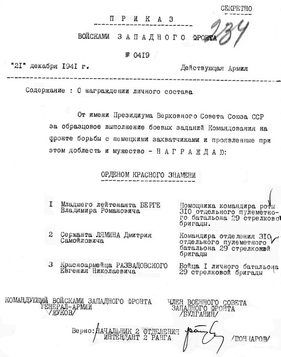 Независимо от того, кто общался с парламентерами, сам факт выполнения задания с риском для жизни неоспорим. Их было трое, и все они были награждены орденами «Красного Знамени» в соответствии с приказом Западного фронта № 0419 от 21.12.1941 г. с формулировкой «за образцовое выполнение боевых заданий командования на фронте борьбы с немецкими захватчиками и проявленные при этом доблесть и мужество»[937]. Фамилии участников этих событий подверглись искажениям. То, что немецкий историк сильно переврал в своем рассказе фамилию полковника Ерохина, назвав его «Юхвин», удивления не вызывает. Однако и в книге Г.И. Бердникова, воевавшего в 1-й УдА, ни один из парламентеров не носит своей настоящей фамилии. Поэтому сейчас нужно сказать, что это были: помощник командира роты 310-го опб младший лейтенант Берге Владимир Романович, сержант того же батальона Лямин Дмитрий Самойлович и боец 1-го олсб красноармеец Развадовский Евгений Николаевич.