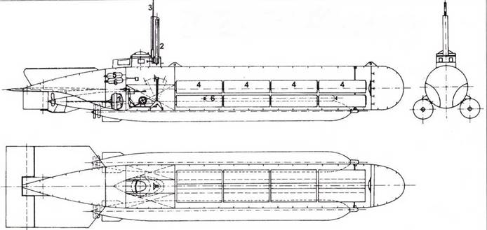 I. Электродвигатель. 2. Компас. 3. Перископ. 4. Аккумуляторы. 5. Баллон с кислородом. 6. Баллон со сжатым воздухом.