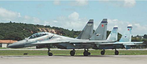 Венесуэльские военные уже смогли воочию ознакомиться с возможностями российских самолетов Су-30МК2. Как сообщалось в прошлом номере нашего журнала, пара таких опытных истребителей (№501 и 502) побывала в самом начале июля в Венесуэле и даже приняла участие в военном параде по случаю Дня независимости этой страны 5 июля (на фото запечатлен момент перелета двух «Сухих» в Венесуэлу во время их промежуточной посадки в аэропорту Ресифи в Бразилии 30 июня 2006 г.).