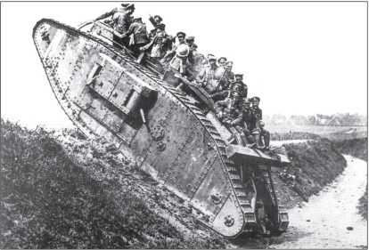 Танк Mk IV «самка» выдвигается в бой позади стрелковой цепи.