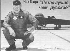 14 октября 1997 г. на авиабазе Эдварде в Калифорнии 74-летний бригадный генерал ВВС США Чак Егер (Chack Yeager) разогнал свой F-15 до М=1,06, повторив то, что совершил здесь ровно 50 лет назад на ракетоплане Белл Х-1, когда впервые в истории преодолел звуковой барьер. Один из самых известных летчиков Америки, Егер накануне своего 75-летия любезно предоставил "АиВ" право впервые на русском языке напечатать отрывки из его "Автобиографии"* и прислал помещенное здесь фото. Работающий сейчас в Лондоне Игорь Д.Бабенко (которому, кстати, принадлежит идея этой публикации) сделал перевод двух глав из книги, в которых генерал выражает свое отношение к советской авиации. Журнальный вариант этого перевода мы и публикуем. Как нетрудно заметить, манера, в которой Егер ведет свой рассказ, не отличается строгостью изложения фактов, поэтому "АиВ" обратился к одному из участников описываемых событий генерал-лейтенанту авиации в отставке С.А.Микояну с просьбой сделать необходимые комментарии. Воспоминания Степана Анастасовича приведены сразу за текстом Егера. Редакция "АиВ" сердечно благодарит обоих генералов и надеется, что в совокупности их воспоминания дают достаточно полное представление о происшедшем.