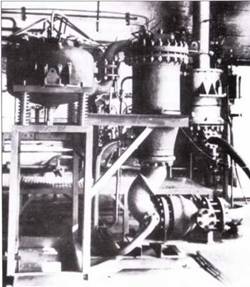 Установка для генерации пара на испытательном стенде типа XVII в США: на переднем плане видна камера сгорания с сепаратором, далее – каталитическая камера.