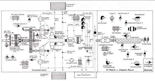 План монтажа машин и механизмов силовой установки подлодки WK 202 и схема турбинной установки Вальтера (справа).