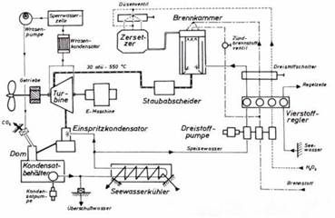 Схема турбинной установки Вальтера (без компрессора) для подлодки XVII серии.