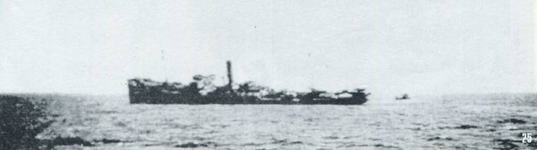 Одновременно с нападением низких торпедоносцев с кормы по правому борту нас атаковали два ДБ-3, летевшие на высоте 2000 м. Они сбросили на конвой две торпеды на парашютах (интересно отметить, что в первой радиограмме с лидера конвоя значилось, что на конвой сброшено три торпеды и две авиамины — Прим. Авт.). Место падения находилось в 1000 м на запад от парохода. Торпеды упали вертикально. Парашюты раскрылись на высоте около 1800 м. Длина торпед примерно 5 м. При встрече с водой парашюты отсоединились. Через 10 сек после падения на воду — один взрыв на грунте. Глубина моря — 45 м. Взрывное действие напоминает глубинную бомбу. Парашюты затонули. Пароход «Продромос» наблюдал четвертый торпедный след, шедший с востока. Точных данных о курсе торпед дать невозможно.