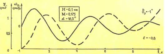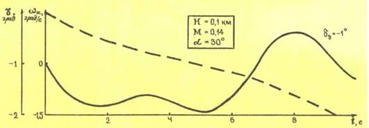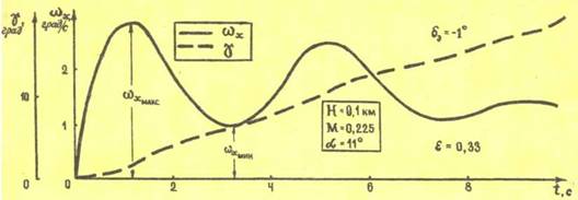 Как видно из рис. 2, уже при полете на а«11° наблюдаются значительные колебания угловой скорости крена (оцениваются по величине и знаку нормируемого параметра ε = ωxmin/ωxmax
