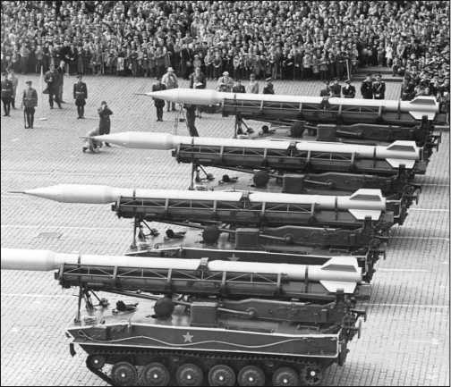 Пусковые установки 2П16 ракетного комплекса 2К6 «Луна» в парадном строю. Москва, 1 мая 1964 года. На пусковых установках ракеты ЗР10 с надкалиберной боевой частью, оснащенной ядерным зарядом.