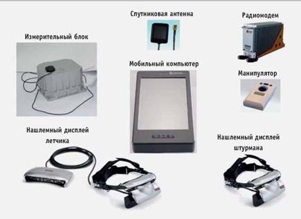 В состав ПНО входят мобильный компьютер (электронный планшет или просто вычислитель без индикатора), предназначенный для работы в жестких условиях; манипулятор (типа «трекбол»); измерительный блок с приемником спутниковой навигации (возможно с двумя приемниками), инерциальными датчиками, датчиками статического и динамического давления (возможно с двумя), выносным магнитометром; нашлемные дисплеи в виде очков с электронными индикаторами и наушниками (летчику и штурману); радиомодем для организации передачи данных между вертолетами и пунктом управления или штабом на земле; спутниковая (одна или две) антенна (рис. 1).