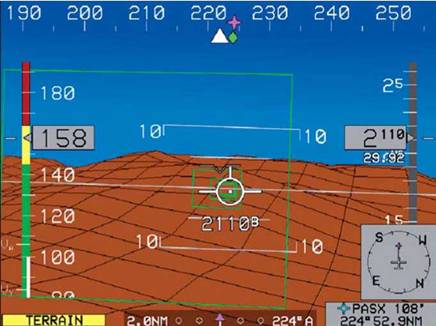За рубежом (в частности, в США) в практику активно внедряется оборудование, позволяющее получать синтезированное изображение закабинного пространства — вид «из вертолета на землю» (рис. 2). Такая индикация существенно повышает безопасность полетов по сравнению с цифро-шкальной (особенно при полетах над пересеченным рельефом в сложных метеоусловиях). Однако она имеет и ряд недостатков, связанных с невысокой точностью пилотирования при заходе на посадку, возможной потерей ориентировки при выводе вертолета из сложного пространственного положения при больших углах крена и тангажа, несвоевременным и неожиданным для экипажа предупреждением об угрозе безопасности полета, в частности, о возможности столкновения воздушного судна с землей, и др.