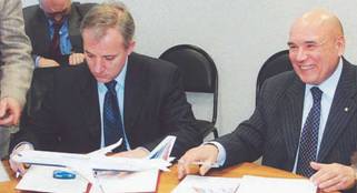 12 февраля в Казани Наиль Хайруллин (на фото справа) и Евгений Зарицкий (слева) подписали договор между ФГУП «Казанское авиационное производственное объединение им. С.П. Горбунова» (КАПО) и ОАО «Финансовая лизинговая компания» (ФЛК) о производстве в период 2005-2007 гг. 10 дальнемагистральных самолетов Ту-214. Первый из них может быть сдан в эксплуатацию уже в конце 2005 г. Еще четыре машины планируется построить в 2006 г., а оставшиеся пять – до конца 2007 г. Эксплуатантом самолетов Ту-214 станет авиакомпания «Трансаэро». Генеральный директор «Трансаэро» Ольга Плешакова сообщила, что накануне ее компания и ФЛК подписали комплект договоров о финансовом лизинге этих десяти самолетов сроком на 15 лет. Интерьер и компоновка салона Ту-214 (на 210 пассажиров) будут полностью соответствовать стандартам авиакомпании «Трансаэро».