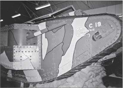 Тот же танк Mk I С19 «Клэн Лэсли» на Сомме в октябре 1916 г. в камуфляжной окраске по схеме, разработанной С. Соломоном.