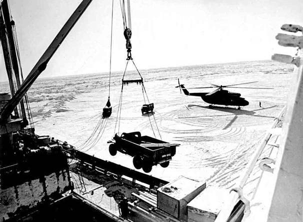 В период выполнения грузовых операций стояла морозная погода, так что транспорт не повреждал ледовую дорогу. Конечно, трещина, отделявшая припай от берега, «дышала», но ее постоянно забивали обломками льда и бревнами, так что задержек в движении колесной техники не возникало. В последний день с помощью экипажа атомного ледокола «Ленин» удалось выгрузить 1,2 тыс. тонн.