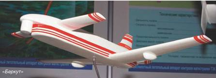 Свой новый проект БЛА представило на выставке и ОАО «Туполев». Это БЛА «Беркут», выполненный по схеме «утка» с толкающим винтом маршевого двигателя.