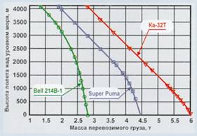 Весьма важно, что тяговые характеристики соосной схемы вертолета в полной мере обеспечили высокую производительность вертолета в процессе выполнения логгинга. На рис. 4 представлены тяговые характеристики соосного вертолета Ка-32А11ВС, французского вертолета Super Puma AS-332C и американского вертолета Bell-241 В-1 в диапазоне высот Н от 0 до 1500 м. Анализ этих характеристик позволяет констатировать, что вертолет Ка-32А11ВС поднимает и перевозит груз массой до 5000кг при температуре до t=+15° С и высоте висения Н=1000м. имея при этом определенные преимущества перед аналогичными вертолетами западных фирм.