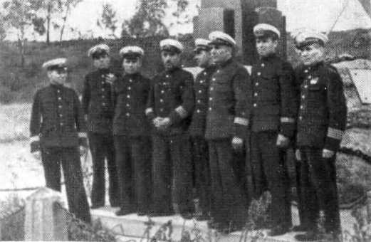 В. М. Гришанов, А. Ф. Петрухин (первый и второй слева), В. Н. Лежава (четвертый слева), А. Т. Ворожилов (крайний справа) у обелиска в честь моряков, погибших на Карельском перешейке. Фото 1940 г.