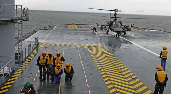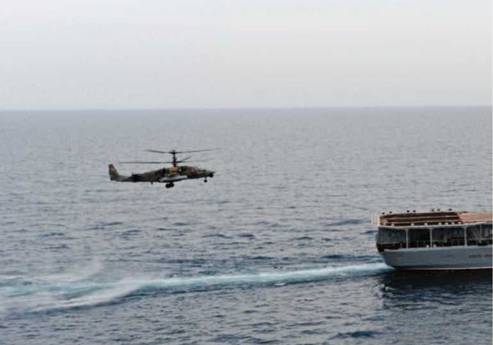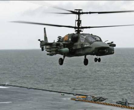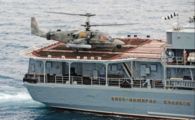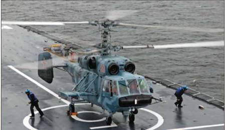 К августу 2011 г. была согласована программа специальных испытаний Ка- 52 по возможности взлета и посадки с боевого корабля. В качестве «опытового судна» был выбран БПК «Вице-адмирал Кулаков» из состава Краснознаменного Северного Флота. Решение было, конечно, паллиативом – на кораблях этого проекта предусматривается лишь парное базирование и применение вертолетов типа Ка-27 различных модификаций, что уменьшает целесообразность размещения на нем специализированного ударно-разведывательного вертолета пусть даже с противокорабельными ракетами. Но «Адмирал Флота Советского Союза Н.Г. Кузнецов» был в ремонте, а использовать для испытаний вертолета почти индийский «Викраматидья» (бывший «Адмирал Флота Советского Союза С.Г. Горшков») было явно неуместно. Тем более, что на нем и так хватало проблем. Других авианосцев у России не было. Так что выбирать оставалось между БПК проекта 1155 и эсминцами проекта 956, у которых и ВПП меньше по размеру, да и размещена она почти посередине корабля.