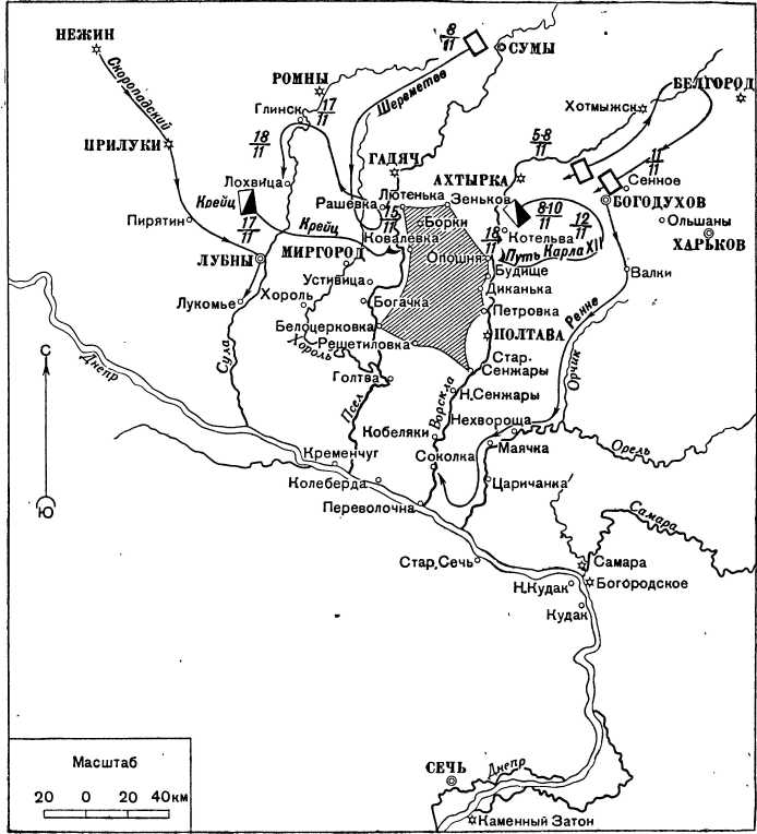 Но в новом районе Карл XII не мог дать армии отдыха, так же как и не мог подкрепить ее предполагаемыми союзниками: русская армия уже сосредоточилась в этом районе и расположилась к началу весны фронтом на запад, прикрываясь р. Ворскла, имея у себя в тылу опорные пункты Богодухов, Краснокутск, Лихачевку и Полтаву.