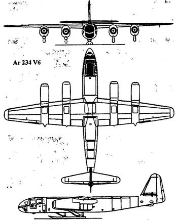 Предсерийный Ar 234В-0 был сменен на сборочной линии на Ar 234В-1, который отличался только установкой автопилота "Патин''-PDS, а оснащение подвесными баками стало стандартом. Но чистый разведчик Ar 234В-1 был только ступенькой к более мощному Ar 234В-2, способному выполнять роли бомбардировщика, "свободного охотника" и фоторазведчика.* Ar 234В-2 сходил со сборочной линии Альт-Ленневица с различными вариантами вооружения, обозначаемыми суффиксами. Так Ar 234В-2/Ь был оснащен двумя фотокамерами Rb 50/30 или Rb 75/30. Ar 234В-2/1 имел бомбоприцел "Лотфе"-7К и предназначался в основном на роль "охотника". Если устанавливался автопилот "Па-thh"-PDS, то добавлялась еще литера "р". Возможность подвески сбрасываемых баков обозначалась "г". Так вариант разведчика и "охотника" вместе с автопилотом и дополнительными баками обозначался Ar 234B-2/bpr или -2/1 рг. Бомбардировщики имели обозначение Ar 234В-2/р, -2/г и -2/рг в зависимости от вариантов оборудования.
