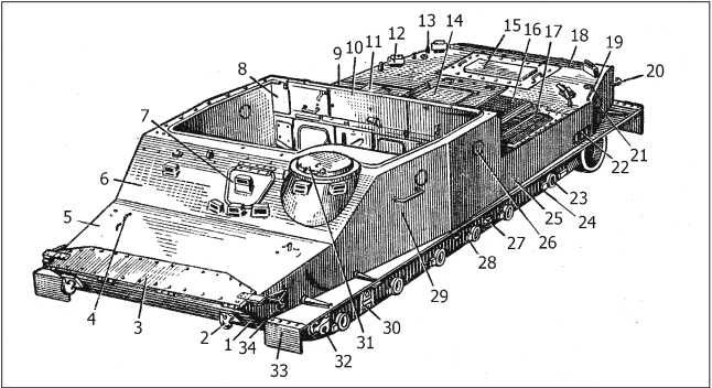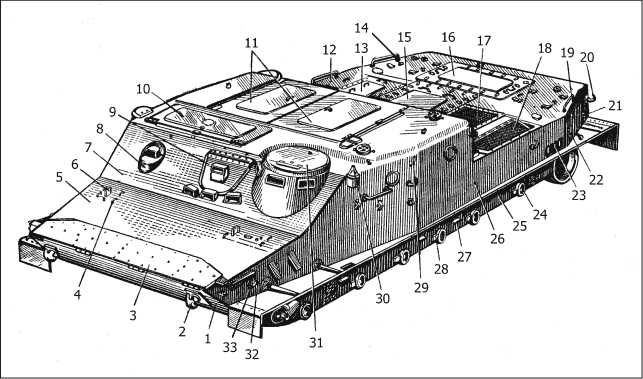 1 — нижний наклонный лист; 2, 20, 33 — буксирные крюки; 3 — волноотражательный щит; 4 — скоба для крепления ограждения фары; 5 — средний наклонный лист; 6 — стойка для крепления фары; 7 — верхний наклонный лист; 8 — вырез для установки прибора наблюдения командира десанта; 9 — крышка люка механика-водителя; 10 — крышка переднего люка; 11 — крышки заднего люка; 12 — передний лист крышки силового отделения; 13 — крышка люка над топливным баком; 14 — зацеп для крепления наружных топливных баков с помощью стяжных лет; 15 — крышка люка над двигателем; 16 — крышка люка над силовой передачей; 17 — съемная броневая решетка; 18 — сетка над диффузором эжектора; 19 — бойка для крепления штепсельной розетки; 21 — кронштейн для укладки трубы подогревателя; 22 — задний верхний бортовой лист; 23 — окно для выброса воды; 24 — кронштейн оси балансира; 25 — нижний бортовой лист; 26 — средний верхний бортовой лист; 27 — кронштейн для пружин и резиновых упоров; 28 — колодка крепления захвата; 29 — кронштейн для укладки антенны; 30 — кронштейн крепления антенны; 31 — крышка люка командира бронетранспортера; 32 — передний верхний бортовой лист.