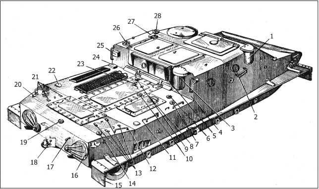 1 — кожух приточного вентилятора; 2 — обзорный лючок; 3 — кожух вытяжного вентилятора; 4 — лист задней стенки десантного отделения; 5 — откидывающийся лист; 6 — пробка лючка для выпуска продуктов сгорания из подогревателя; 7 — пробка лючка для заправки малого топливного бака; 8 — пробка лючка для заправки большого топливного бака; 9 — пробка лючка для заправки системы охлаждения; 10 — пробка лючка для заправки масляного бака; 11 — скоба для крепления укрывочного брезента; 12 — поручень; 13, 21 — кронштейны крепления дополнительных топливных баков; 14, 20 — пробки лючков для заправки смазки в бортовые передачи; 15 — грязевой щиток; 16 — заслонка; 17 — упор-ограничитель; 18 — крюк для буксировки артсистем; 19 — пробка лючка для заправки кормового топливного бака; 22 — кожух клапана водооткачивающей системы; 23 — бон ка крепления решетки для укладки буя; 24 — коробка с выключателем водооткачивающего насоса (МВП-2); 25 — коробка для укладки нагрудного переключателя танкового переговорного устройства (ТПУ); 26 — ограждение люка индивидуального воздухопритока двигателя; 27 — кожух отверстия выброса загрязненного воздуха нагнетателем; 28 — ограждение люка забора воздуха нагнетателем.