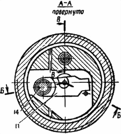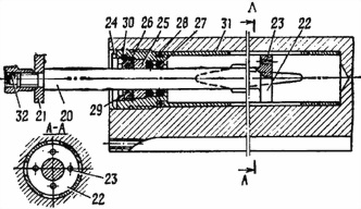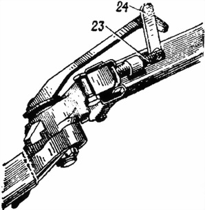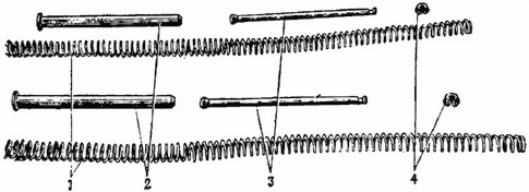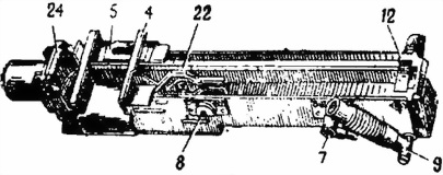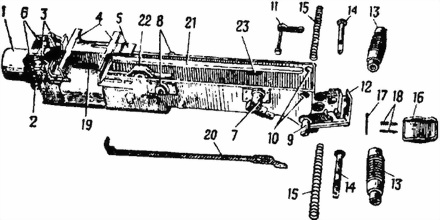 16. Возвратные пружины (рис. 23) служат для возвращения затвора в переднее положение, удержания его в этом положении и торможения затвора при его движении назад. Каждая возвратная пружина имеет направляющую, стержень и замок.