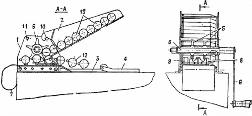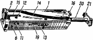 1 — корпус; 2 — верхний лоток; 3 — нижний передний лоток; 4 — нижний задний лоток; 5 — звездка; 6 — рукоятка; 7 — направляющая; 8 — передний съемник; 9 — задний съемник; 10 — передняя стяжка; 11 — задняя стяжка; 12 — лента; 13 — выстрелы