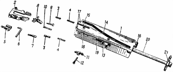 На направляющей имеются полукруглый вырез для головки оси приемника, вырезы для выступов ударника, фиксатор штока, отверстия для оси флажка шептала, отверстие для оси предохранителя, гнездо для стакана и пружины шептала.