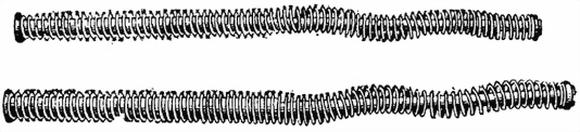 24. Лента для выстрелов (рис. 34) служит для помещения выстрелов и подачи их в приемник гранатомета. Она состоит из отдельных кусков на 10 звеньев каждый. Куски ленты соединяются один с другим с помощью выстрела, звенья между собой в каждом куске — с помощью шплинтов. Звено имеет передние и задние захваты, хвостовик, соединительное кольцо и соединительный выступ.