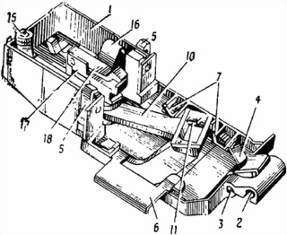Механизм подачи ленты состоит из рычага подачи; подавателя с осью, пружинами и штырем; ролика и пружинного фиксатора рычага подачи, который при закрытом приемнике надежно удерживает ролик в криволинейном пазу на верхней плоскости затвора.