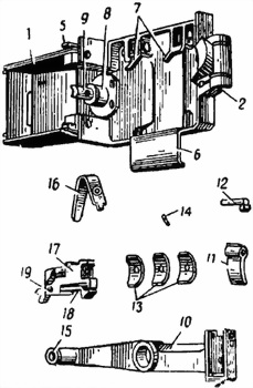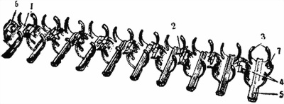 1 — звено ленты; 2 — шплинт; 3 — передние захваты; 4 — задние захваты; 5 — хвостовик; 6 — соединительное кольцо; 7 — соединительный выступ