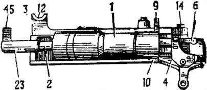 Гидравлический регулятор темпа стрельбы состоит из цилиндра, которым является корпус ударника, двух уплотнителей и штока с ручкой регулирования темпа стрельбы,