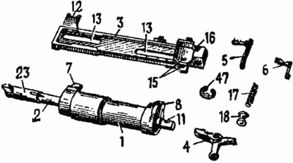 а — в собранном виде; б — в разобранном виде; 1 — патрубок; 2 — отверстие для замыкателя ствола; 3 — проушины для оси приемника; 4 — клинья съемннка; 5 — лоток; 6 — отверстия для фиксаторов приемника; 7 — кронштейн для крепления прицела; 8 — цапфенные гнезда для крепления гранатомета на станке; 9 — полуось; 10 — отверстия для замыкателя затыльника; 11 — замыкатель затыльника; 12 — затыльник; 13 — рукоятка гранатомета; 14 — тяга рукоятки; 15 — пружина рукоятки; 16 — спусковой рычаг; 17 — ось спускового рычага; 18 — пружины спускового рычага; 19 — входное окно для выстрелов; 20 — спусковая планка; 21 — направляющая затвора; 22 — копир досылателя; 2З — упор для фланца штока гидротормоза; 24 — ось приемника, лотка и съемника