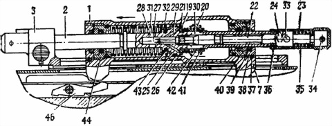 а — в собранном виде; б — а разобранном виде; в — схема устройства гидравлического регулятора темпа стрельбы; 1 — ударник; 2 — шток; 3 — направляющая; 4 — шептало; 5 — флажок; 6 — предохранитель; 7 — передний выступ; 8 — задний выступ; 9 — прилив; 10 — боевой взвод; 11 — вырез для фиксатора; 12 — полукруглый вырез; 13 — вырезы для выступов ударника; 14 — фнксатор штока; 15 — отверстия для оси флажка шептала; 16 — отверстие для оси предохранителя; 17 — пружина шептала; 18 — стакан шептала; 19 — клапан; 20 — пружина клапана; 21 — паз на клапане; 22 — игла; 23 — ручка регулирования темпа стрельбы; 24 — спиральный паз; 25 — утолщение штока; 26 — фторопластовое кольцо; 27 — осевой канал штока; 28 — поперечное отверстие; 29 — наклонное отверстие; 30 — овальное отверстие; 31 — боевая пружина; 32 — втулка; 33 — штифт иглы; 34 — стопорный винт; 35 — пружина; 36 — кольце штока; 37 — цилиндрический штифт; 38 гайка уплотнителя; 39 — кольцо; 40 — опорное кольцо; 41 — стопорное кольцо; 42 — втулка; 43 — кольцо; 44 — корпус уплотнителя; 45 — флажок ручки регулирования темпа стрельбы; 46 — разобщитель; 47 — шайба