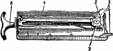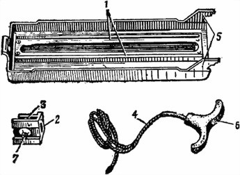Снаряжение ленты выстрелами может производиться вручную или снаряжательной машинкой. Снаряжательная машинка (рис. 35) состоит из корпуса, верхнего лотка для помещения выстрелов; нижнего (переднего и заднего) лотка для помещения ленты; звездки с рукояткой для перемещения ленты и снаряжения ленты выстрелами, направляющей для движения снаряженной ленты, переднего и заднего съемников для отделения выстрелов от ленты.