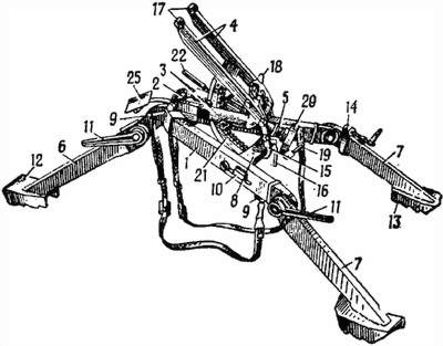 а — вид станка слева; б — механизм точного горизонтироваиня; 1 — основание станка; 2 — вертлюг; 3 — нижняя люлька; 4 — верхняя люлька; 5 — механизм вертикальной наводки; 6 — передняя нога; 7 — задние ноги; 8 — сектор горизонтальной наводки; 9 — антабка для крепления лямки; 10 — кронштейн крепления корпуса с батареей системы освещения прицела; 11 — зажим ноги; 12 — сошник; 13 — насечка; 14 — механизм точного горизонтнроваиия; 15 — ползун; 16 — рукоятка зажима горизонтальной наводки; 17 — цапфы; 18 — фиксатор; 19 — рукоятка маховичка; 20 — маховнчок; 21 — зубчатый сектор; 22 — рукоятка зажима вертикальной наводки; 23 — винт; 24 — флажок; 25 — гильзоотражатель