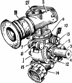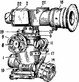 а — вид слева; б — вид справа; 1 — корпус; 2 — головка прицела; 3 — ось прицела; 4 — овальная выемка; 5 — штифт; 6 — угломерное кольцо; 7 — указатель больших делений угломера; 8 — барабанчик угломера; 9 — указатель делений барабанчика угломера; 10 — отводка; 11 — поперечный уровень; 12 — шкала больших делений прицела; 13 — указатель шкалы больших делений при цела; 14 — барабанчик прицела; 15 — указатель делений барабанчика прицела; 16 — продольный уровень; 17 — планка для крепления патрона подсветки; 18 — наглазник; 19 — мушка; 20 — целик; 21 — основание для присоединения патрона подсветки сечки прицела; 22 — винт для крепления светофильтра