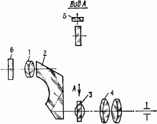 1 — объектов; 2 — приема; 3 — сетка; 4 — окуляр; 5 — защитное стекло; 6 — светофильтр