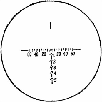 Влево и вправо от верхнего угольника находится шкала боковых поправок, равная ±0-60. Цена делений этой шкалы равна пяти тысячным (0-05). Она обозначена цифрами 20, 40, 60.