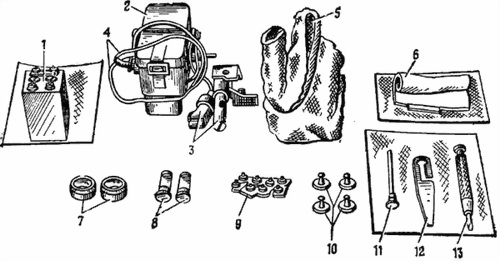 1 — аккумуляторная батарея 2КНБН 1,5; 2 — корпус системы освещения; 3 — патроны подсветки; 4 — провода; 5 — чехол для системы освещения; 6 — салфетка; 7 — светофильтры; 8 — ампулы в оправе; 9 — лампочки; 10 — колпачки; 11 — ключ; 12 — ключ-отвертка; 13 — отвертка