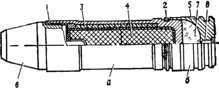 а — осколочная граната; б — пороховой заряд; в — взрыватель; 1 — корпус; 2 — ведущий поясок; 3 — пружина (осколочная рубашка); 4 — разрывной заряд; 5 — гильза; 6 — капсюль-воспламенитель; 7 — нитроглицериновый порох