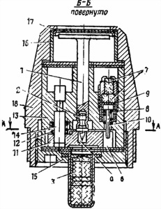 а — ударный механизм; б — воспламенительный механизм; в — предохранительный механизм дальнего взведения; 1 — стержень; 2 — жало ударного механизма; 3 — капсюль-детонатор; 4 — капсюль-воспламенитель; 5 — пружина жала; 6 — жало воспламенительного механизма; 7 — замедлитель; 8 — пружина; 9 — колпачок; 10 — стопор; 11 — заслонка; 12 — поворотная пружина; 13 — втулка; 14 — ось; 15 — поджимное кольцо; 16 — опорное кольцо; 17 — мембрана; 18 — корпус