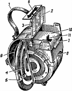 1 — ручка; 2 — крышка; 3 — защелка крышки; 4 — створка; 5 — защелка створки; 6 — шторка; 7 — зацеп; 8 — зуб; 9 — улитка; 10 — горловина; 11 — выступ
