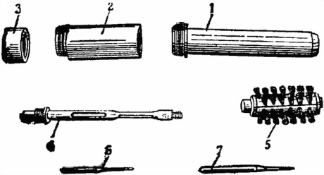 — щетки: одна — для чистки и другая — для смазки канала ствола; они имеют на металлическом стержне резьбу для соединения с протиркой;