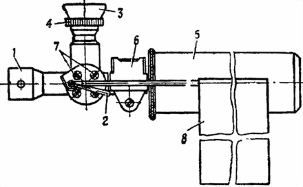 1 — объектив; 2 — рукоятка; 3 — окуляр; 4 — диоптрийное кольцо; 5 — стержень; 6 — уровень; 7 — регулировочные винты; 8 — флажок