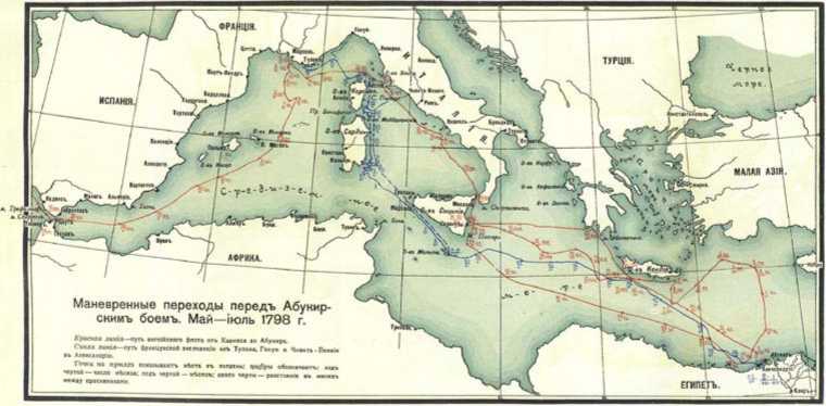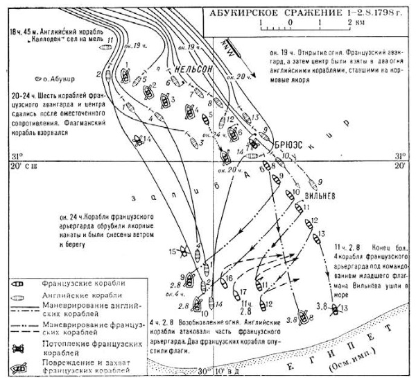 Не соответствует истине утверждение английских историков об уникальности нельсоновского маневра. Именно проходом вдоль берега в 1676 году знаменитый французский адмирал Турвиль разбил объединенный голландско-испанский флот. А еще за 300 лет до этого английский же король Эдуард III аналогично выиграл сражение при Слюи. И совсем уж невозможно поверить, что англичане (включая и самого Нельсона) не знали о маневре с обходом под берегом турецкого флота, примененном в 1791 году вице-адмиралом Ушаковым в сражении у мыса Калиакрия.