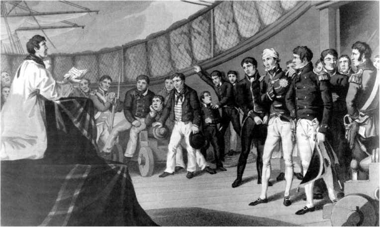 Молебен на флагмане Нельсона Вэнгарде после Абукира. Раненного Нельсона поддерживает капитан Берри
