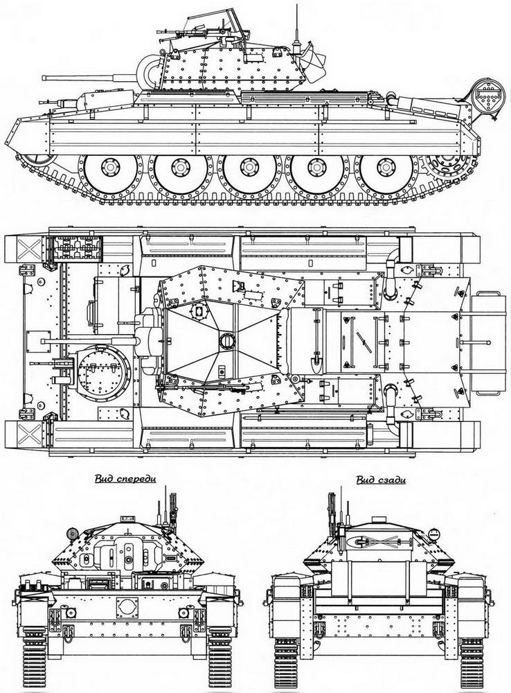 Что касается конструкции «Ковенантера», то ее характеризовала весьма плотная компоновка, порой за гранью здравого смысла. Так, в моторно-трансмиссионном отделении не хватило места для воздушных фильтров, и их разместили на крыше МТО, закрыв легкими броневыми (а возможно, и не броневыми) кожухами. Не поместились в МТО и радиаторы системы охлаждения, которые установили в носовой части корпуса слева от механика-водителя, а охлаждающая жидкость поступала к двигателю и обратно по трубопроводам, проложенным по днищу машины. При этом вентилятор, обдувавший оба радиатора, приводился во вращение от мотора поворота башни. Корпус и башня не отличались совершенством форм и имели подчас необъяснимую конфигурацию. Например, борта башни были скошены под острым углом, а лобовой лист располагался почти вертикально. Особенностью конструкции танка стало двухслойное бронирование лобовых и кормовых листов корпуса, а также лобового, кормового и бортовых листов башни. Строго говоря, броневыми являлись только наружные листы, внутренние же выполнялись из простой высококачественной стали и не всегда были тоньше наружных. Скажем, наружный лобовой лист башни имел толщину 20 мм, а внутренний — 19 мм, для бортов это соотношение составляло 10 и 9,5 мм, для кормы — 12 и 12,5 мм. Эти толщины для верхнего лобового листа корпуса были одинаковыми — по 14 мм. Башня не имела командирской башенки. Для посадки экипажа служил широкий люк в кормовой части башни, закрывавшийся складывающейся назад крышкой. В литой маске, отличавшейся по конструкции у машин ранних и поздних выпусков, устанавливались 2-фунтовая пушка и спаренный с ней 7,92-мм пулемет BESA. Слева от пушки в маске находилась амбразура телескопического прицела, а справа от маски ставился 2-дюймовый дымовой гранатомет. Кроме того, все машины могли оснащаться зенитной установкой Lakeman для 7,7-мм легкого пехотного пулемета Bren. В походном положении как сама установка, так и пулемет перевозились в ящике, крепившемся на правом борту башни. На крыше башни размещались два перископических прибора наблюдения Mk IV: один — командира танка, другой — заряжающего. В распоряжении наводчика имелся прибор наблюдения в лобовом листе башни, слева от маски пушки. Помимо этого, в каждом борту башни были предусмотрены приборы наблюдения со стеклоблоками триплекс, закрывавшиеся броневыми заслонками. У танков ранних выпусков на корме башни крепился бак для питьевой воды, впоследствии перенесенный внутрь танка. Для фиксации радиоантенн служили две точки на крыше башни, но на практике использовалась из них только одна.