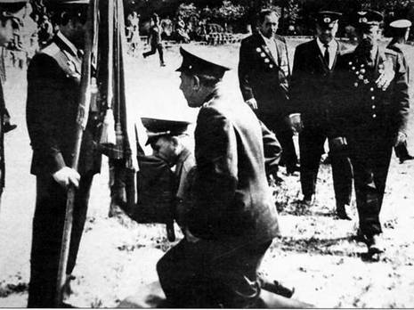 У знамени 10-го ОРАП В.В. Кибалко и генерал-лейтенант Буланов. Подходят Г.А. Сметанин, Ф.П. Селиверстов и В.А. Демидов. Щучин, 4 августа 1971 г.