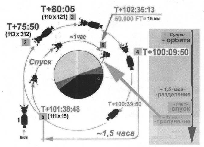 Орбита-1 (30 мин.), Орбита-2 (58 мин. 58 сек.) – орбита Луны, после расстыковки CSM;
